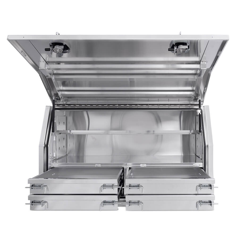 Our OZY Full Lid range with internal drawers, is Constructed from premium marine grade aluminium. Using only the highest quality parts, these toolboxes feature tig welded seams, whale tail compression locks, adjustable shelf, heavy duty drawer slides with 50KG rating, weather and dust resistant seals along with dual gas struts. These boxes are designed to not only look great, but to also be extremely Affordable, Reliable and Durable.