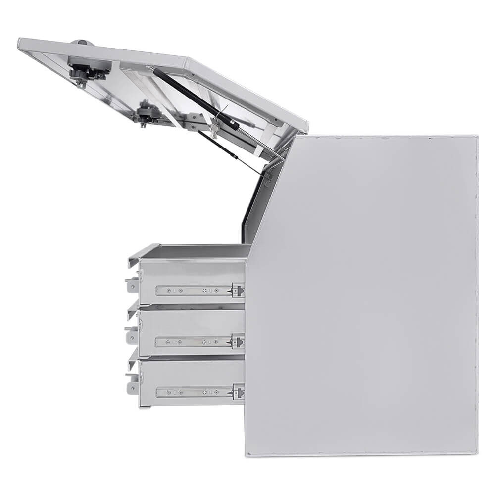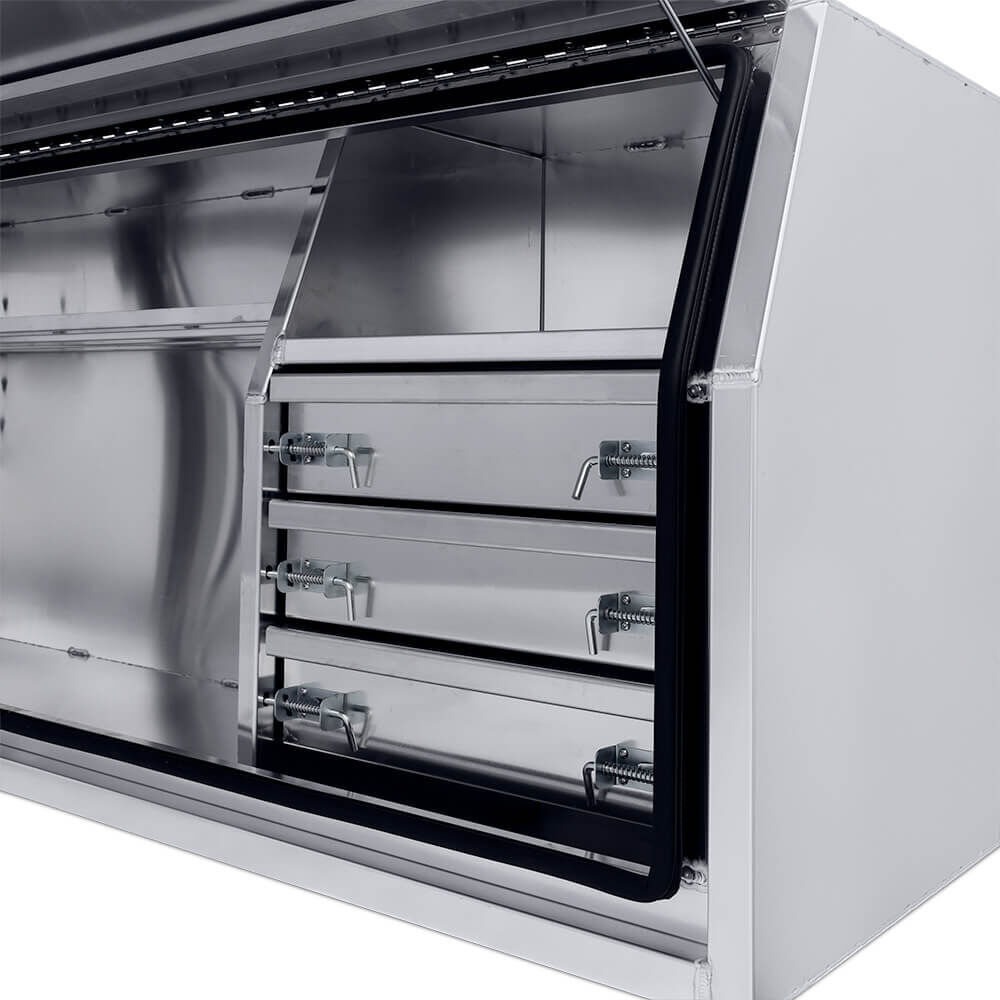 Our OZY range with internal drawers, is Constructed from premium marine grade aluminium. Using only the highest quality parts, these toolboxes feature tig welded seams, whale tail compression locks, adjustable shelf, heavy duty drawer slides with 50KG rating, weather and dust resistant seals along with dual gas struts. These boxes are designed to not only look great, but to also be extremely Affordable, Reliable and Durable.