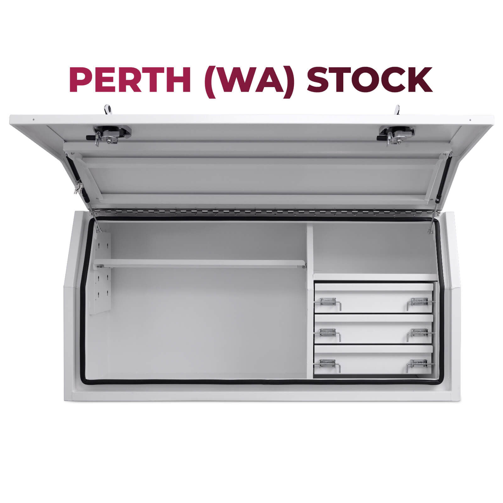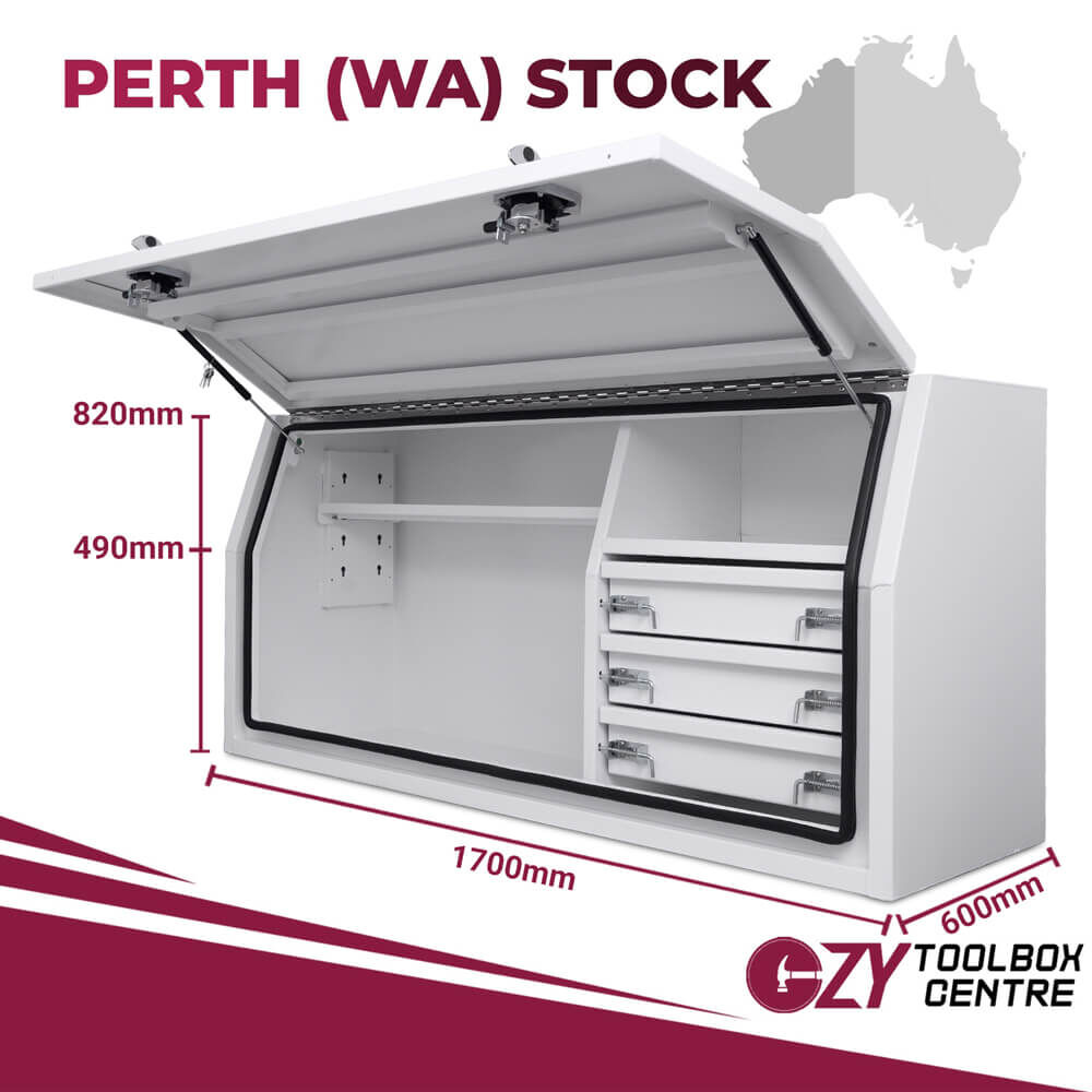 Our OZY Powder Coated White range with internal drawers, is Constructed from premium marine grade aluminium. Using only the highest quality parts, these toolboxes feature tig welded seams, whale tail compression locks, adjustable shelf, heavy duty drawer slides with 50KG rating, weather and dust resistant seals along with dual gas struts. These boxes are designed to not only look great, but to also be extremely Affordable, Reliable and Durable.