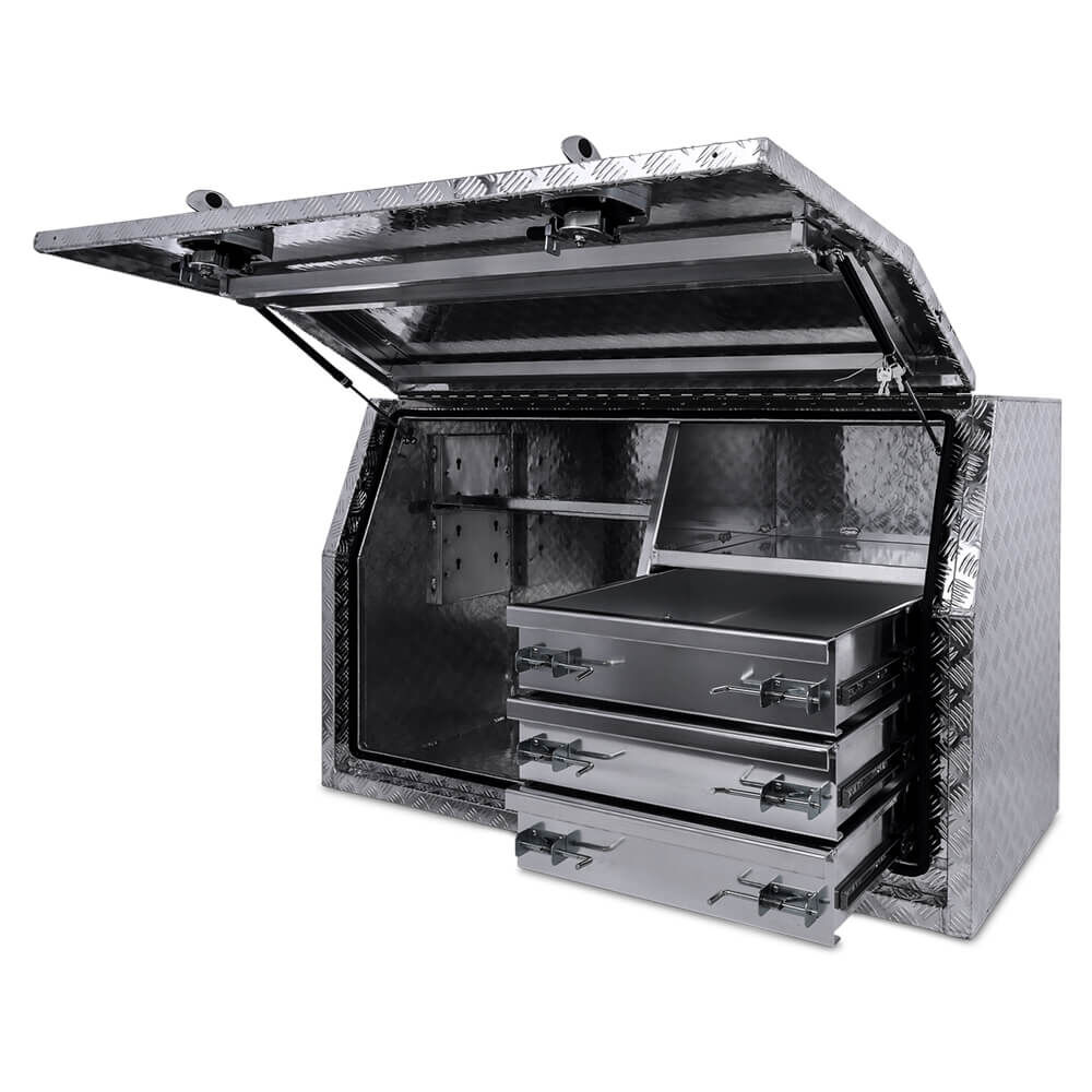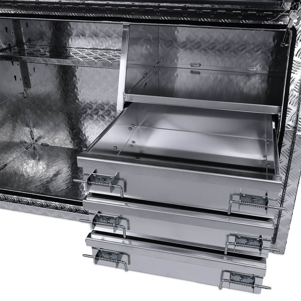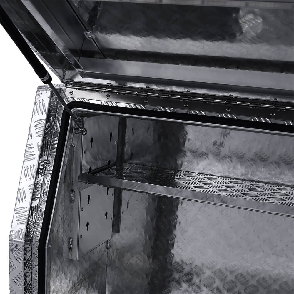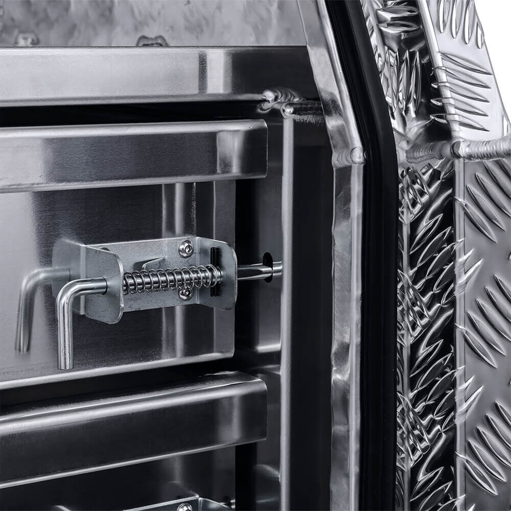 High-quality 3mm checker plate aluminium toolboxes made for the toughest of conditions. Full seam welded units made from high-grade aluminium to suit your storage needs. Perfect for storing tools, machinery, camping gear, and anything in between. Cushion seal to provide a weather and dust resistant box to keep your belongings dry. These toolboxes are suitable for utes, trucks, caravans, and trailers. Call us on 1300OZYBOX (1300-699-269) for all your toolbox needs!