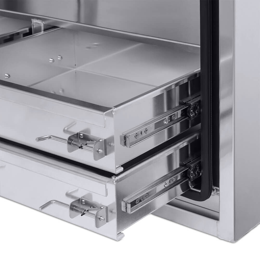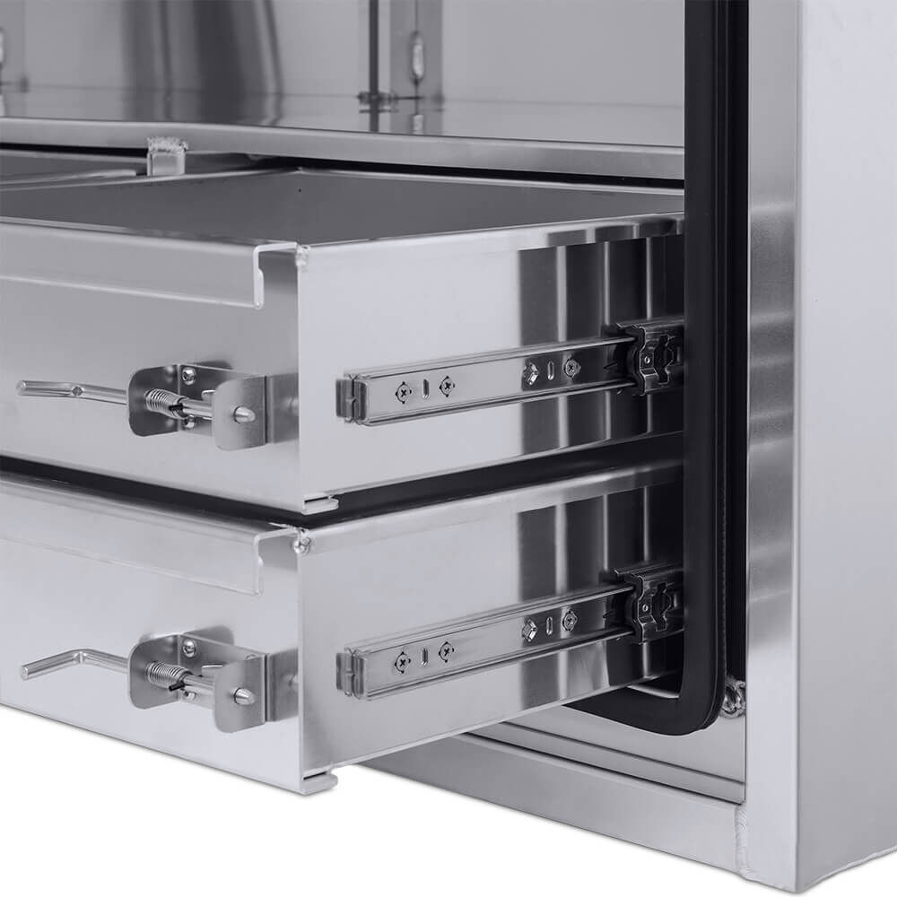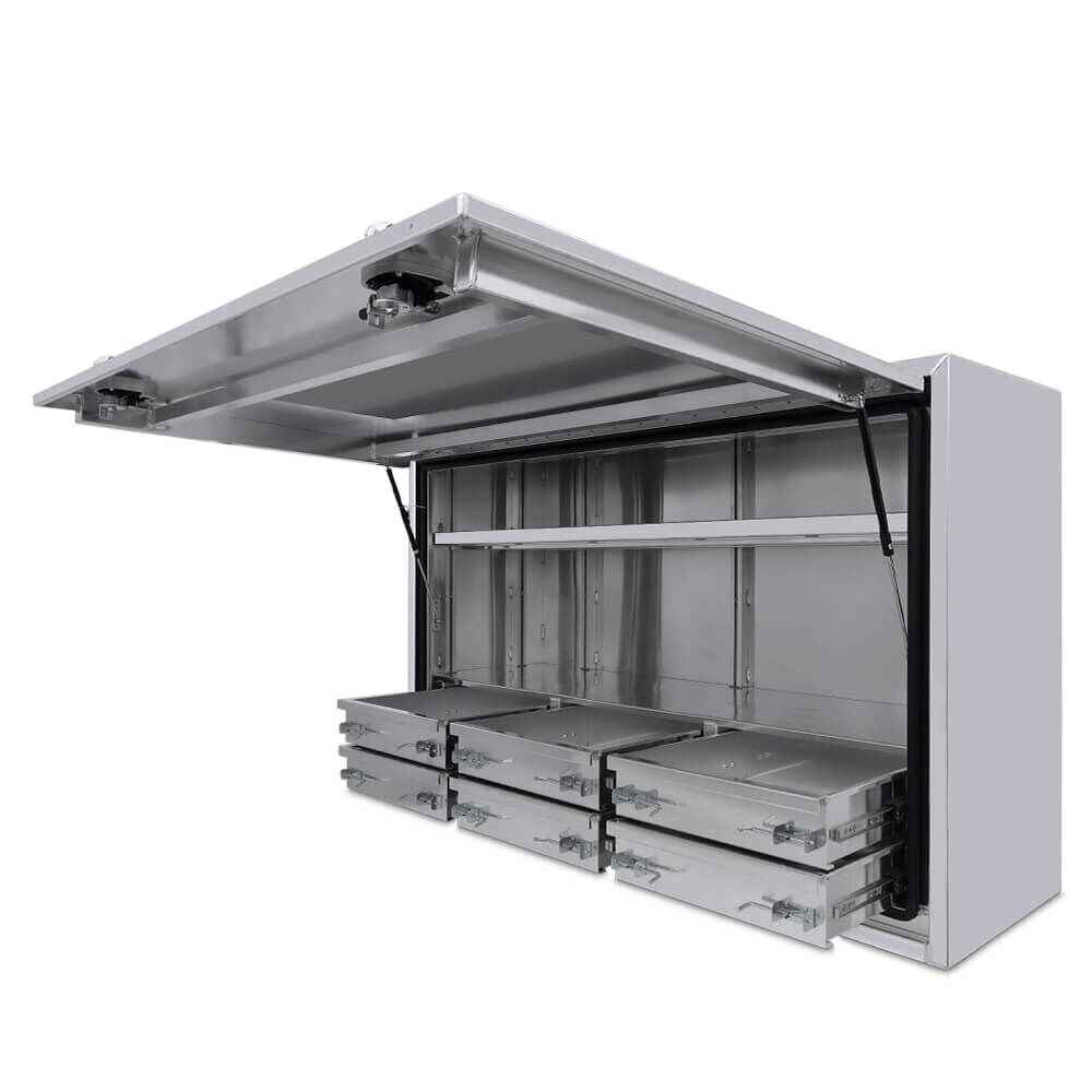 High-quality aluminium truck toolboxes made for the toughest of conditions. Full seam welded units made from low maintenance and easy to maintain aluminium, reinforced corners for extra strength. 6 x internal drawers and 1 adjustable shelve make these Perfect for storing tools, machinery, camping gear, and anything in between. Cushion seal to provide a weather and dust resistant box to keep your belongings dry. These toolboxes are suitable for utes, trucks, caravans, and trailers. Call us on 1300OZYBOX (1300-699-269) for all your toolbox needs!